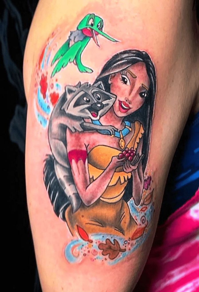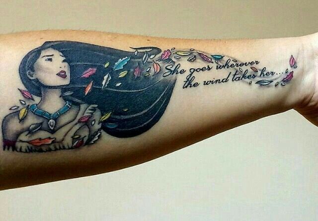 The image of Pocahontas standing in the wind, often surrounded by leaves, birds, and flowing water, is one of the most popular designs for Pocahontas tattoos. This image symbolizes freedom and the idea of living in harmony with the world around us. The wind and nature motifs reflect her connection to the earth and the belief in following one’s instincts and emotions.
